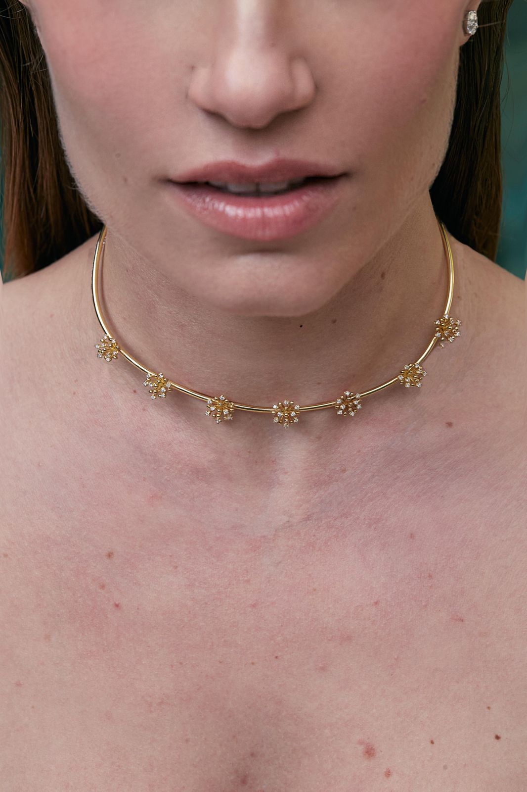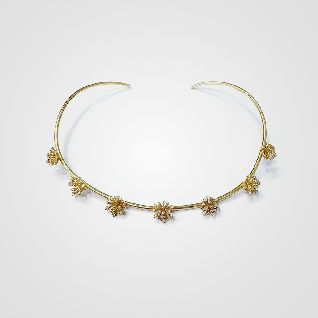 O colar Florescer une formas orgânicas encontradas na natureza e design contemporâneo. Uma peça delicada e impactante.