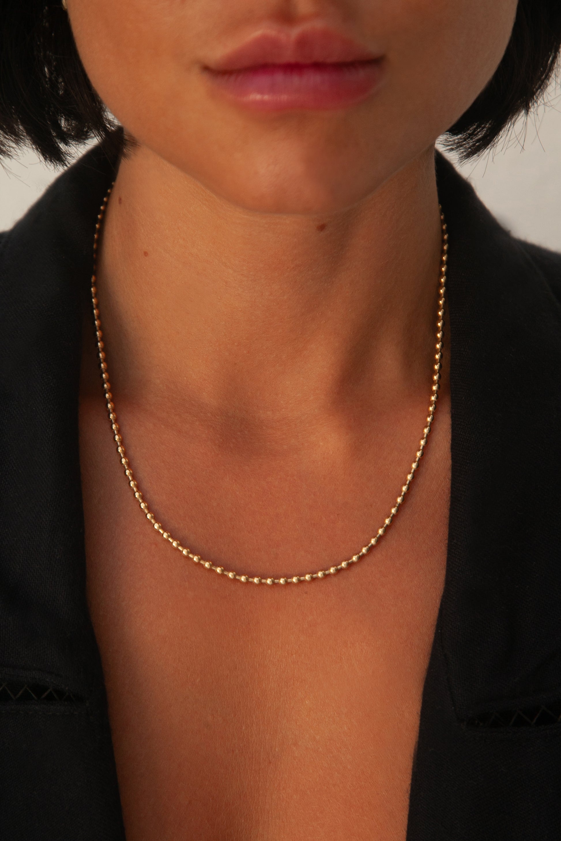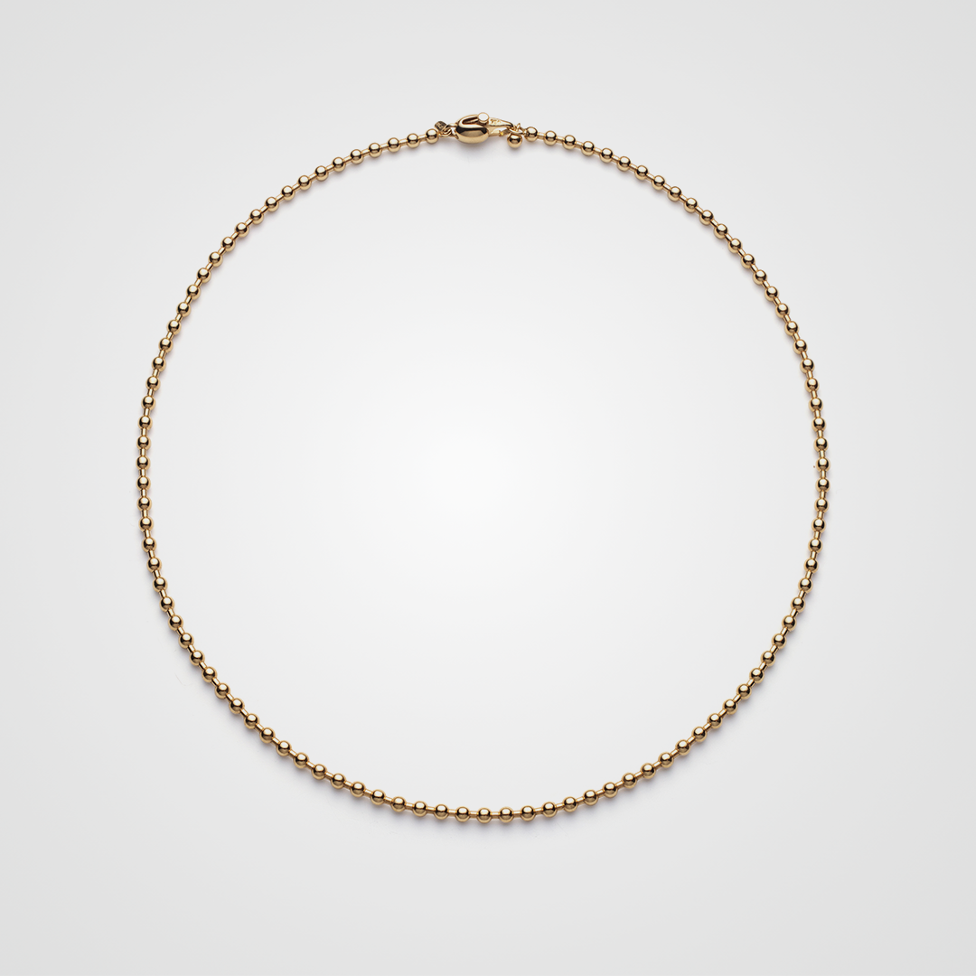 O colar Veredas, feito em ouro amarelo 18k, trás esferas que simbolizam o continuo ciclo da vida.