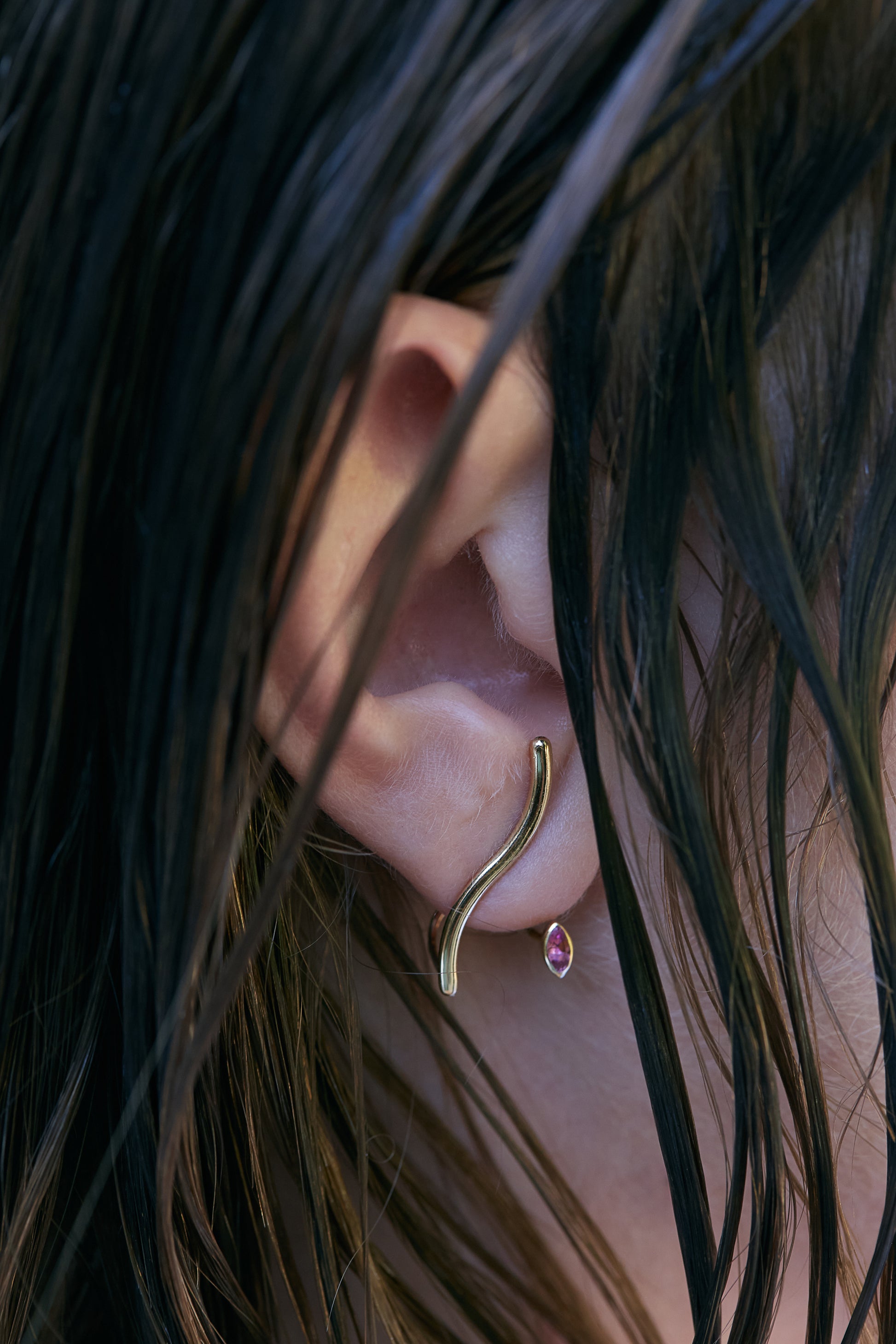Os brincos Délicatesse encantam pela sua beleza e simplicidade. O design em formato de navete flutuante é moderno e minimalista, e transpassa a orelha com delicadeza e suavidade. Feitos de topázio incolor e turmalina rosa, esses brincos combinam a força e o poder do topázio com a suavidade e a delicadeza da turmalina rosa. Juntos, eles criam um contraste interessante que representa a dualidade da mulher: sua força e sua suavidade, sua determinação e sua delicadeza. O nome Délicatesse significa “delicadeza” em francês, e é uma referência à elegância e sutileza desse acessório.