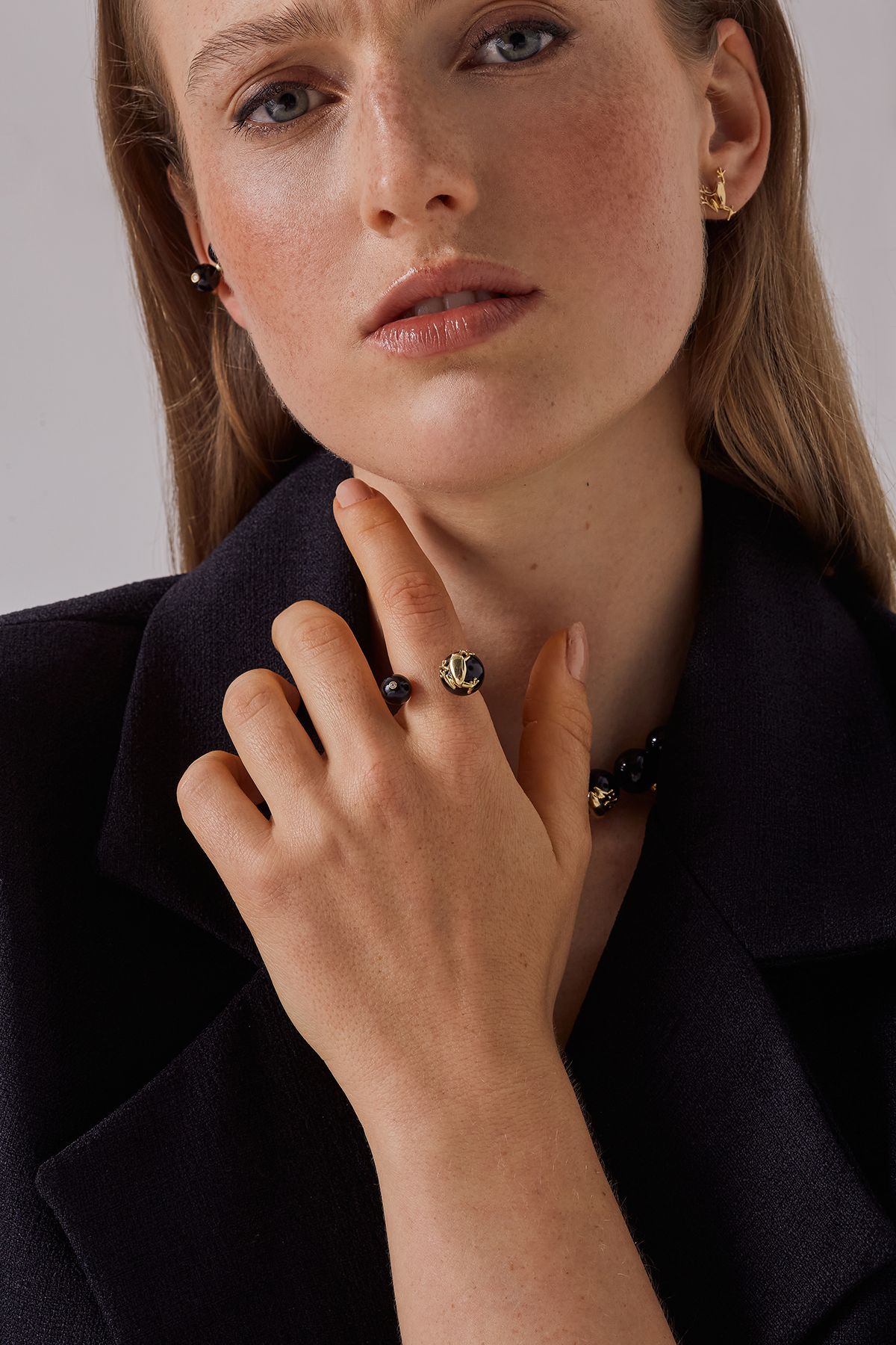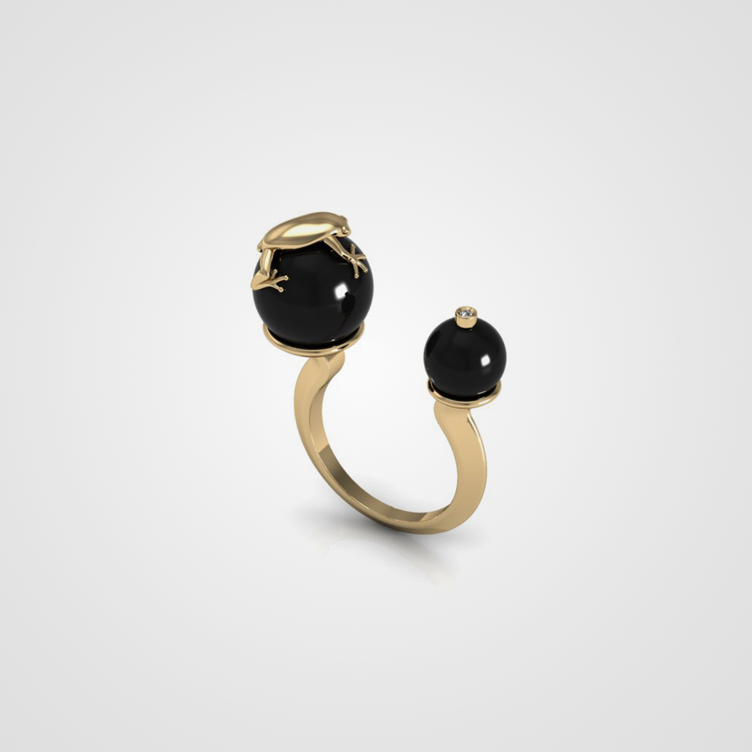 O Anel Flottant pode ser considerado um amuleto, suas duas esferas em ônix que flutuam sobre os dedos, representam o dualismo que a vida carrega: uma delas está o sapo, símbolo da renovação, abundância e fertilidade, enquanto a outra está o diamante, pedra símbolo da resistência. A composição do aro em ouro amarelo 18k, torna a peça ainda mais especial.