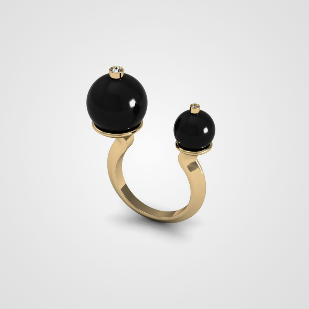 O Anel Flottant Bri e suas duas esferas em ônix que flutuam sobre os dedos, representam o dualismo que a vida carrega e os diamantes cravados, pedra símbolo da resistência dão brilho e força a peça, aro em ouro amarelo 18k.