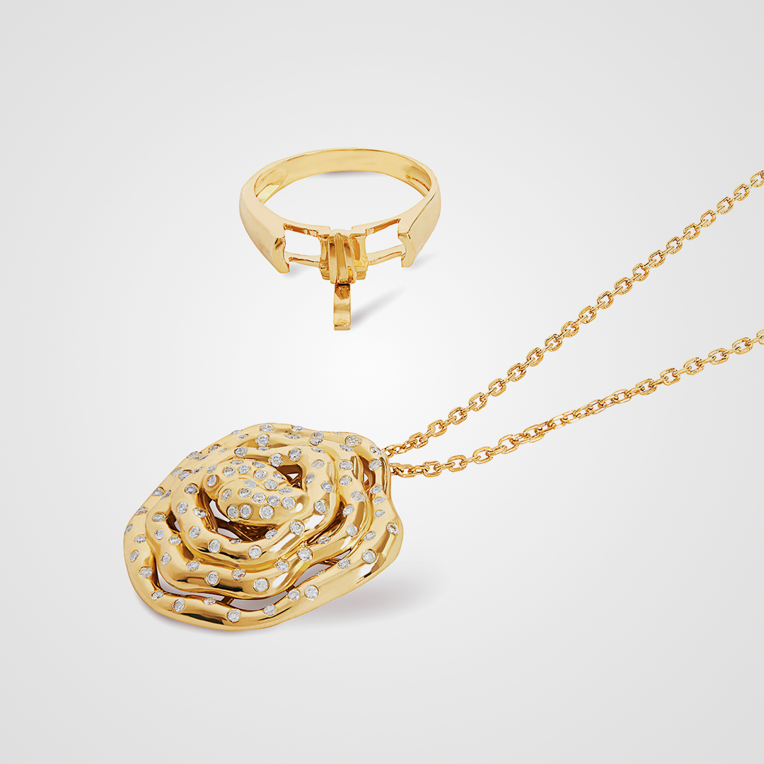 O anel Jardin de la Femme é uma peça deslumbrante, que representa a beleza natural da feminilidade e o poder da natureza. O design deste anel é inspirado em uma flor com suas pétalas delicadas e elegantes, que simbolizam a conexão entre a natureza e a mulher. Feito de ouro amarelo 18k, o anel possui diamantes cravejados nas pétalas, adicionando um brilho suave e sutil que complementa a beleza da peça. Além disso, o anel pode ser transformado em um pingente, permitindo que a peça seja usada de várias maneiras, adicionando versatilidade e estilo ao seu visual. A transformação é fácil e rápida, tornando este anel ainda mais valioso e desejável.
