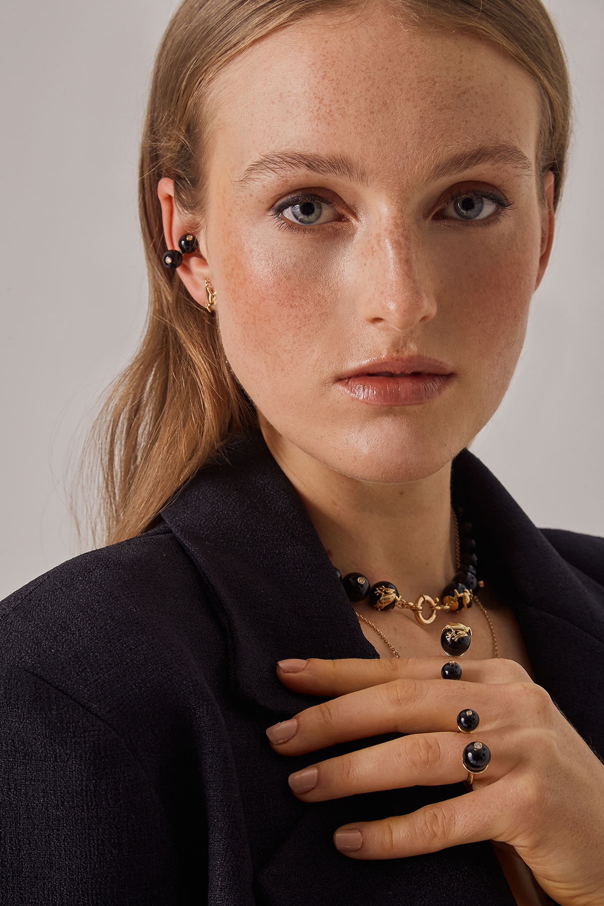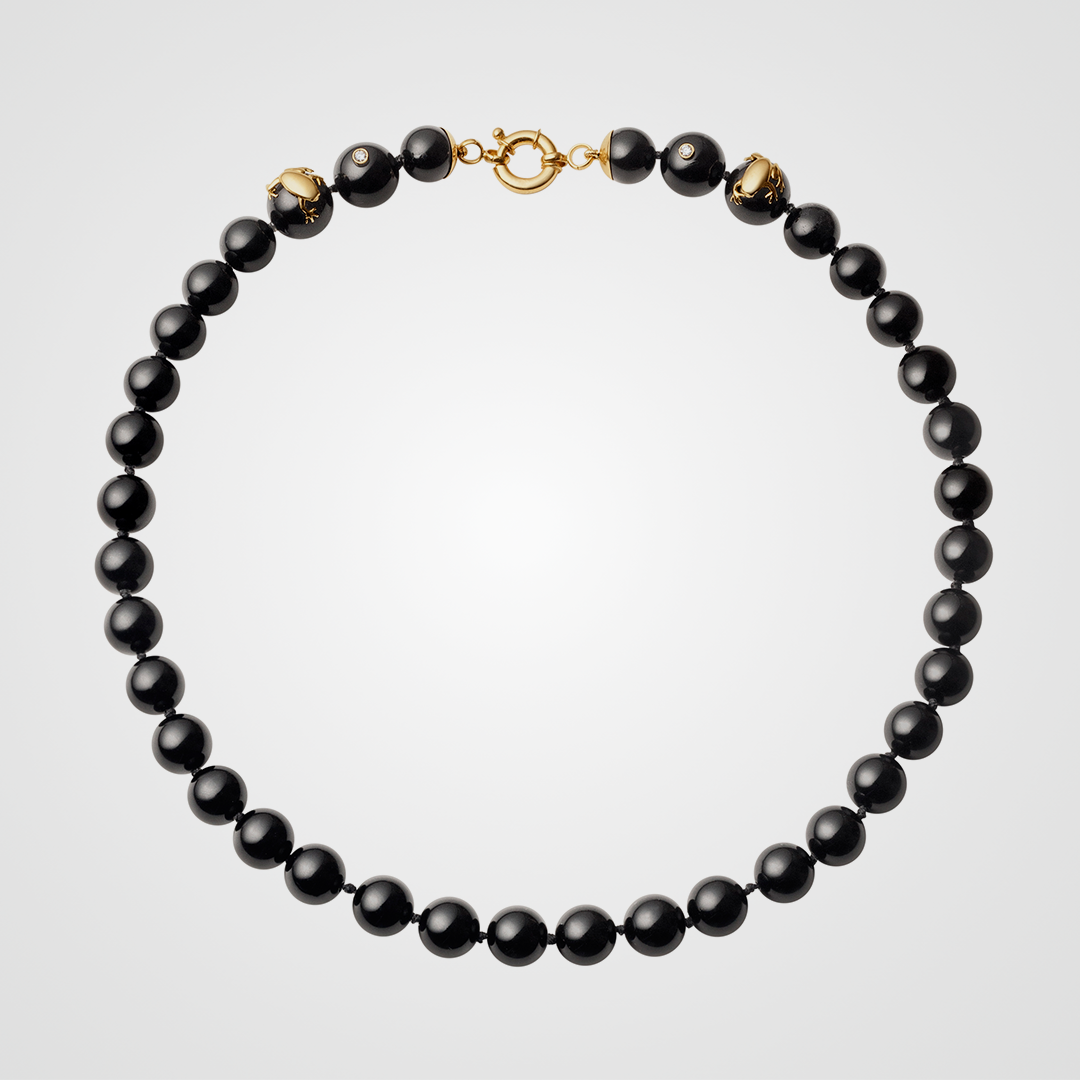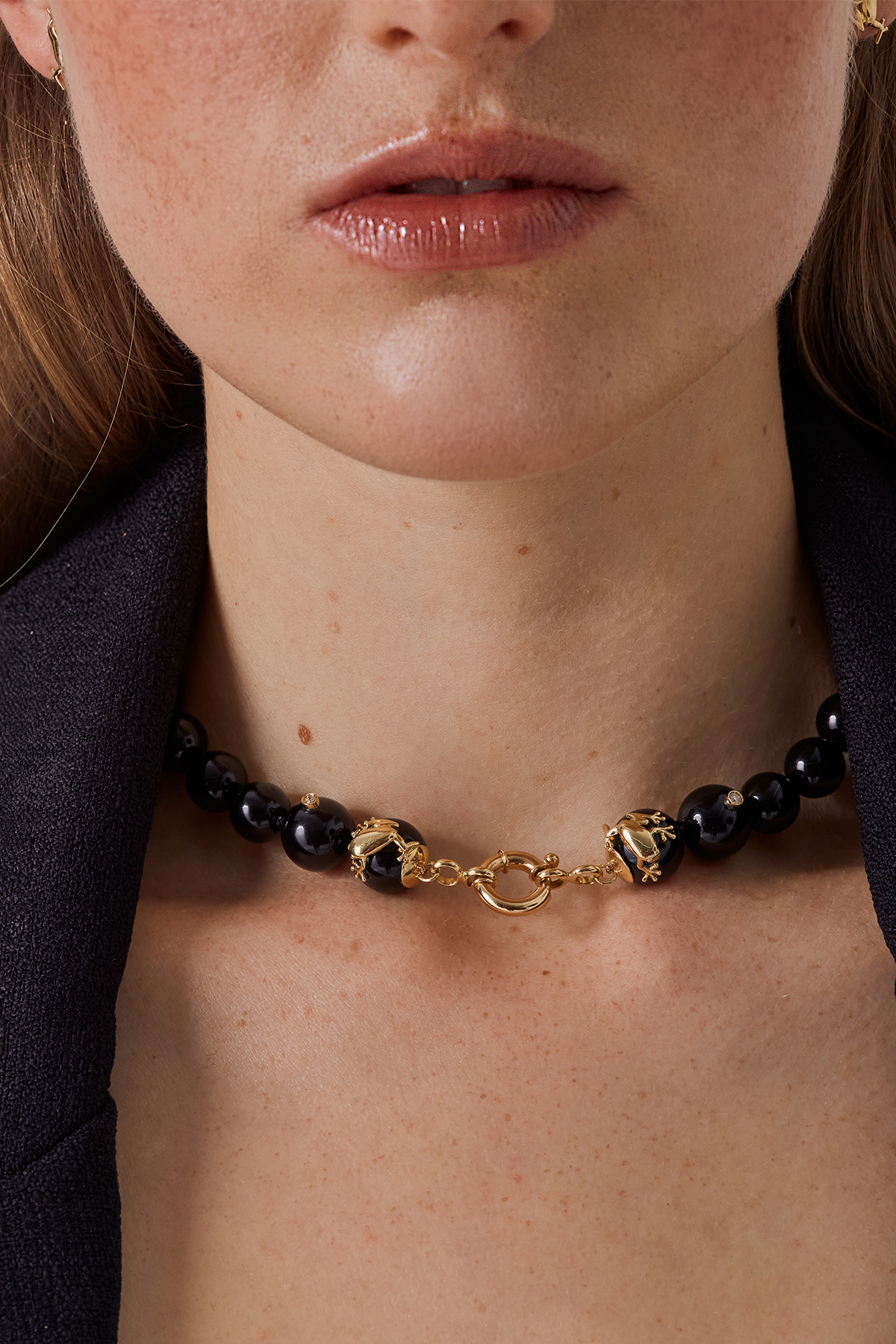 Colar em esferas de ônix, brilhantes e ouro amarelo 18k.