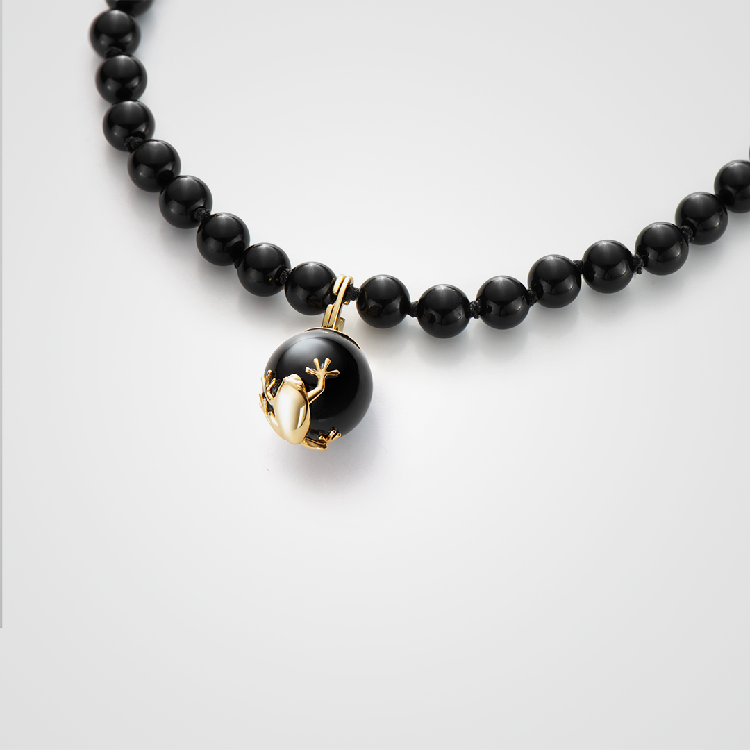 Charm em ouro amarelo 18k com esfera de ônix. Possui fecho especialmente desenvolvido para ser acoplado na grande maioria das correntes, colares, pulseiras e argolas (possibilitando também o uso em brincos).